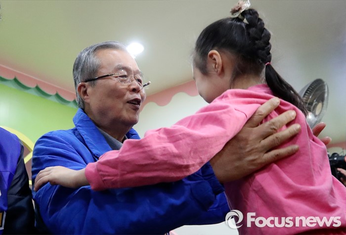 (아산=포커스뉴스) 김종인 더불어민주당 비대위 대표 겸 선대위원장이 5일 오전 충남 아산시 진성어린이집을 방문해 어린이를 안아보고 있다.