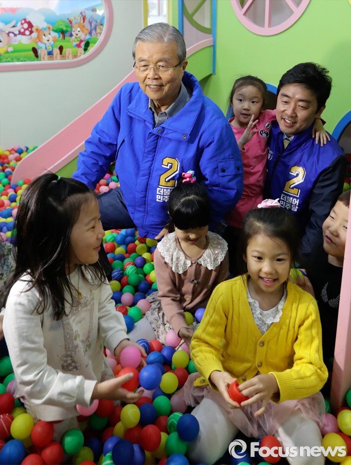 (아산=포커스뉴스) 김종인(왼쪽) 더불어민주당 비대위 대표 겸 선대위원장과 강훈식 충남 아산을 후보가 5일 오전 충남 아산시 진성어린이집을 방문해 어린이들과 볼풀장에서 즐거운 시간을 보내고 있다.