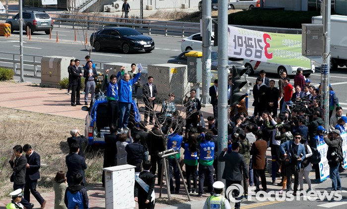 (아산=포커스뉴스) 5일 오전 충남 아산시 배방읍사무소 앞 사거리에서 김종인 더불어민주당 비대위 대표 겸 선대위원장이 강훈식 아산을 후보의 지지를 호소하고 있다.