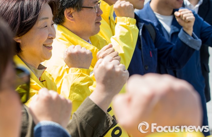 (서울=포커스뉴스) 5일 오전 서울 종로구 성균관대학교 정문 앞에서 윤공규 종로구 후보 지원유세에 나선 심상정(왼쪽 두번째부터) 정의당 상임선거대책위원장, 윤 후보가 대학생들과 기념촬영을 갖고 있다.