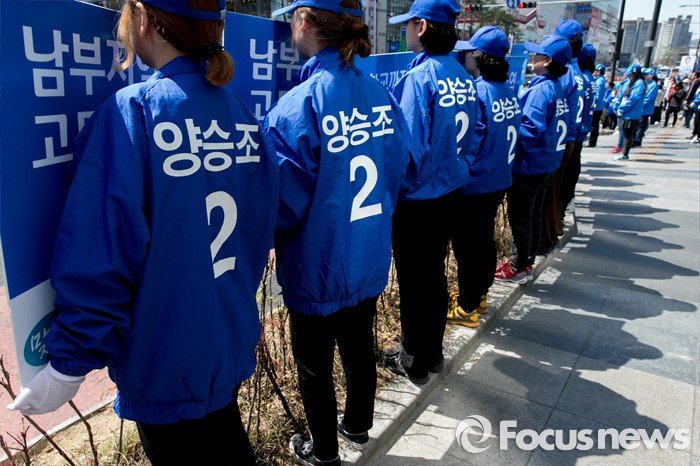 (천안=포커스뉴스) 5일 오전 충남 천안시 신세계백화점 앞에서 열린 더불어민주당 천안지역 합동유세에 참여한 선거운동원들이 지지를 호소하고 있다.