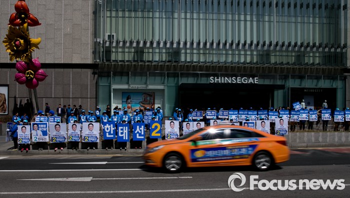 (천안=포커스뉴스) 5일 오전 충남 천안시 신세계백화점 앞에서 열린 더불어민주당 천안지역 합동유세에 참여한 선거운동원들이 지지를 호소하고 있다.