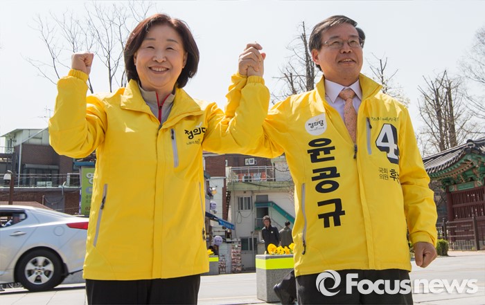 (서울=포커스뉴스) 5일 오전 서울 종로구 성균관대학교 정문 앞에서 윤공규 종로구 후보 지원유세에 나선 심상정(왼쪽) 정의당 상임선거대책위원장이 윤 후보와 포즈를 취하고 있다.
