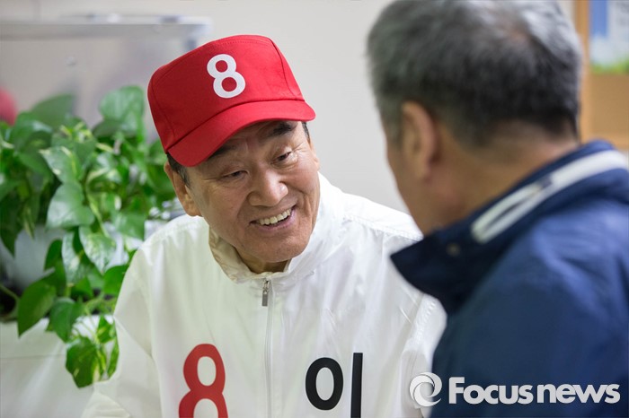 (서울=포커스뉴스) 은평을 무소속 이재오 후보가 5일 오전 서울 은평구 불광노인복지관에서 어르신들에게 점심배식을 하며 유세를 하고 있다.