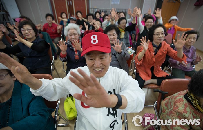 (서울=포커스뉴스) 은평을 무소속 이재오 후보가 5일 오전 서울 은평구 불광노인복지관을 찾아 어르신들과 함께 노래교실에서 수업을 듣고 있다.