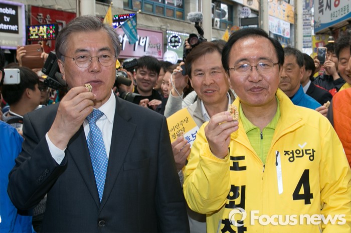 (창원=포커스뉴스) 문재인(왼쪽) 전 더불어민주당 대표가 5일 오후 경남 창원시 성산구 반송시장에서 노회찬(오른쪽) 정의당 창원성산 후보 지원유세 중, 상인이 건낸 과자를 먹고 있다. 노 후보는 창원성산에서 허성무 더불어민주당 후보와 경합에서 승리해, 더민주 · 정의당 단일후보로 출마한다.