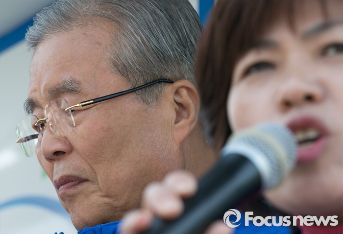 (평택=포커스뉴스) 5일 오후 경기도 평택역 앞 광장에서 열린 더불어민주당 평택지역 합동유세에 참석한 김종인(왼쪽) 비대위 대표 겸 선대위원장이 고인정 평택갑 후보의 발언을 들으며 생각에 잠겨 있다.