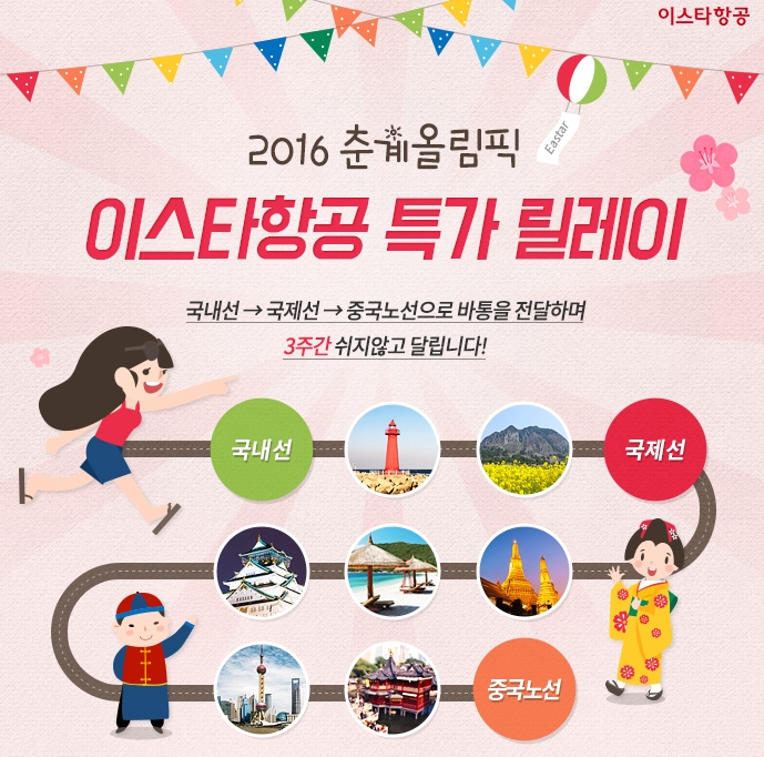 2016년 춘계올림픽 특가 항공권은 2016년 6월7일부터 6월23일까지 이용 가능하다.2016 춘계올림픽 이스타항공 특가 릴레이. <사진제공=이스타항공>