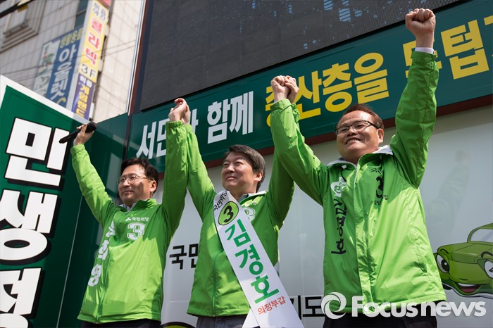 (의정부=포커스뉴스) 안철수 국민의당 상임공동대표(가운데)가 5일 오후 의정부시 태평로 제일시장 앞에서 김경호 의정부갑 후보(오른쪽) 지원유세를 하고 있다.