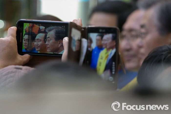 (창원=포커스뉴스) 문재인 전 더불어민주당 대표가 5일 오후 경남 창원시 성산구 반송시장에서 노회찬 정의당 창원성산 후보 지원유세를 마친 뒤, 인터뷰를 하고 있다. 노 후보는 창원성산에서 허성무 더불어민주당 후보와 경합에서 승리해, 더민주 · 정의당 단일후보로 출마한다.