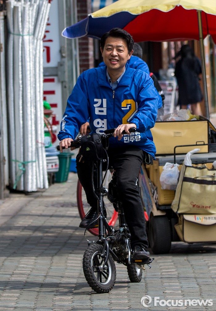 (서울=포커스뉴스) 김영호 더불어민주당 서대문을 후보가 5일 오후 서울 서대문구 백련시장 일대에서 자전거를 타고 주민들을 만나며 한 표를 호소 하고 있다.
