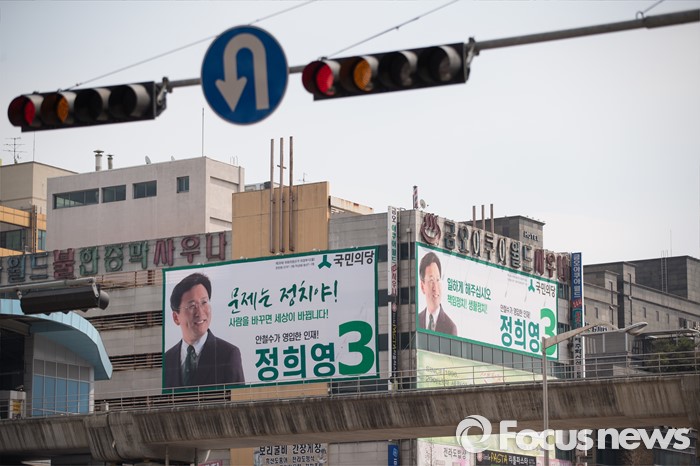 (의정부=포커스뉴스) 정희영 국민의당 의정부을 후보가 5일 오후 의정부시 금오동에서 선거 운동을 하고 있는 가운데 정 후보 선거 사무소에 걸린 기호 3번 현수막이 보이고 있다.