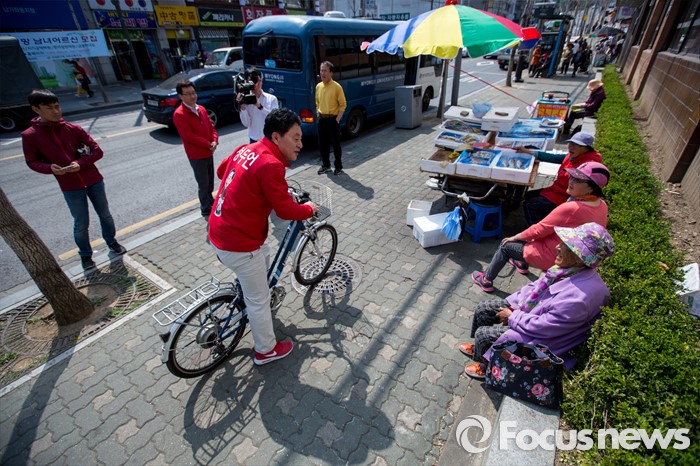 (서울=포커스뉴스) 정두언 새누리당 서대문을 후보가 5일 오후 서울 서대문구 백련시장 일대에서 자전거를 타고 주민들을 만나며 한 표를 호소 하고 있다.