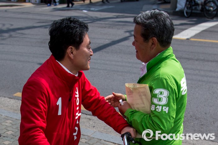 (서울=포커스뉴스) 정두언 새누리당 서대문을 후보와 홍성덕 국민의당 서대문을 후보가 5일 오후 서울 서대문구 백련시장 일대에서 선거운동을 하던 중 대화를 나누고 있다.