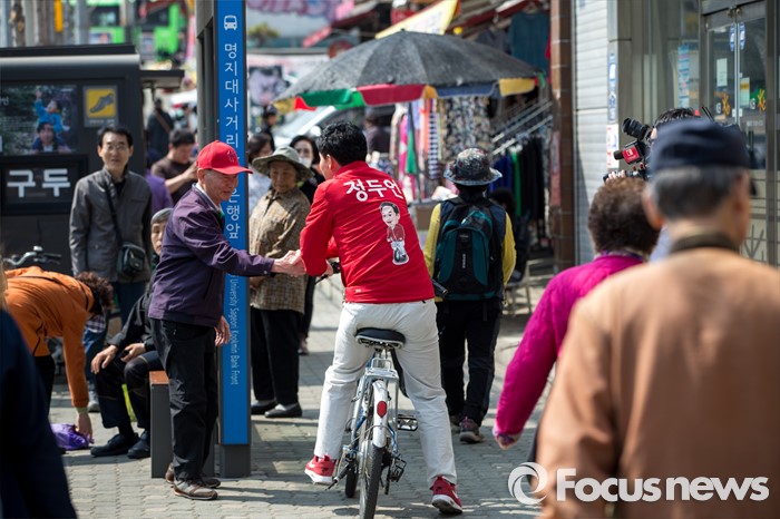 (서울=포커스뉴스) 정두언 새누리당 서대문을 후보가 5일 오후 서울 서대문구 백련시장 일대에서 자전거를 타고 주민들을 만나며 한 표를 호소 하고 있다.