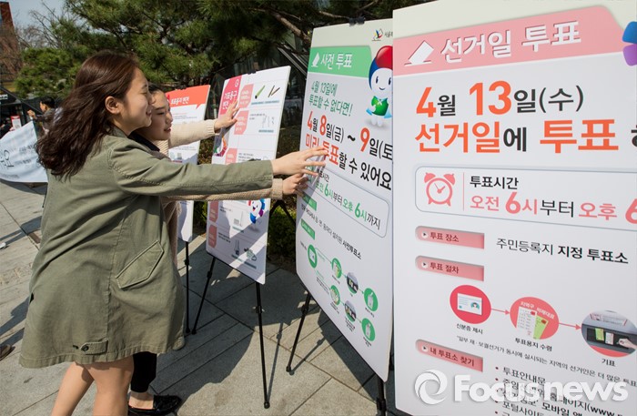 (서울=포커스뉴스) 20대 국회의원선거를 8일 앞둔 5일 오후 서울 종로구 마로니에공원 인근에 설치된 4.13총선 투표참여 홍보자료가 바람에 넘어가자 청년 유권자들이 붙잡고 있다.