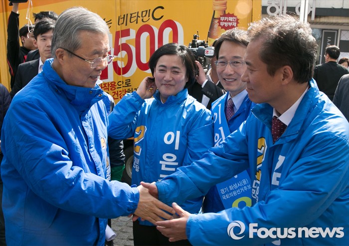 (화성=포커스뉴스) 5일 오후 경기도 화성 봉담읍 하나로마트 앞에서 더불어민주당 화성지역 합동유세를 마친 김종인 비대위 대표 겸 선대위원장이 후보들과 인사하고 있다. 왼쪽부터 김 대표, 이은주 도의원 후보, 이원욱 화성을, 김용 화성갑 후보.