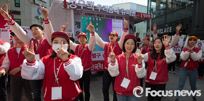 (청주=포커스뉴스) 5일 오후 충북 청주 성안길에서 새누리당 선거운동원들이 지지를 호소하고 있다.