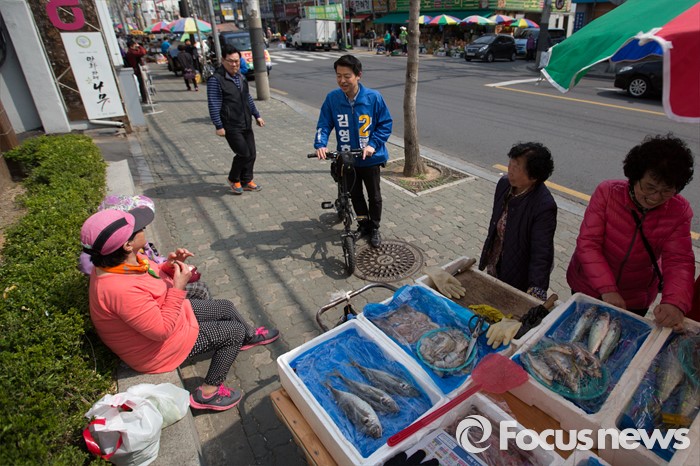(서울=포커스뉴스) 김영호 더불어민주당 서대문을 후보가 5일 오후 서울 서대문구 백련시장 일대에서 자전거를 타고 주민들을 만나며 한 표를 호소 하고 있다.