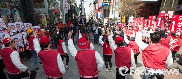(청주=포커스뉴스) 5일 오후 충북 청주 성안길에서 새누리당 선거운동원들이 지지를 호소하고 있다.