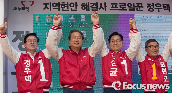 (청주=포커스뉴스) 김무성 새누리당 대표가 5일 오후 충북 청주 성안길에서 정우택, 최현호, 오성균 후보의 지지를 호소하고 있다.