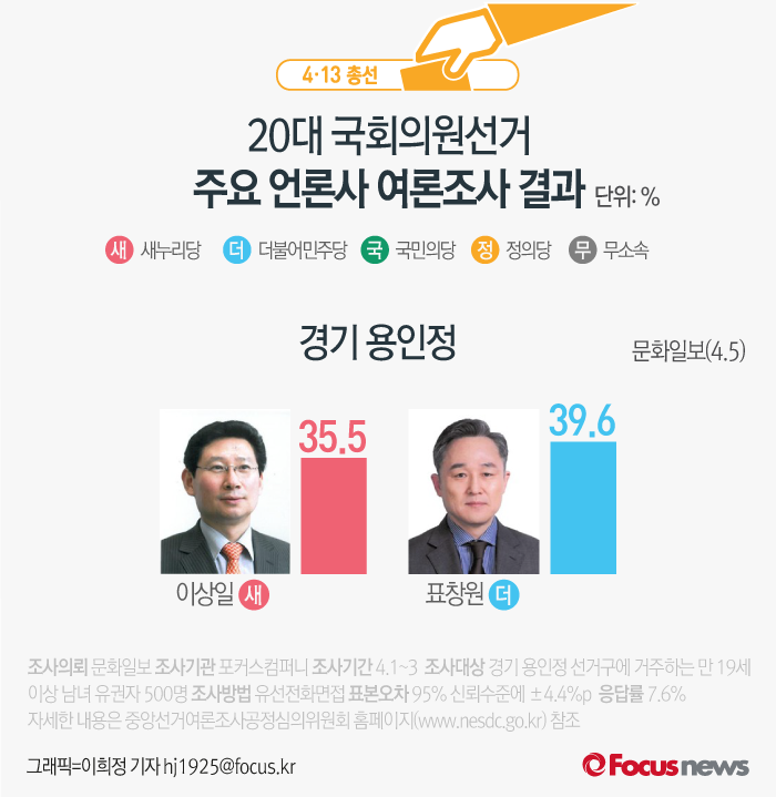 (서울=포커스뉴스) 문화일보가 포커스컴퍼니에 의뢰해 5일 발표한 여론조사 결과에 따르면 새누리당 이상일 후보의 지지율은 35.5%, 더불어민주당 표창원 후보의 지지율은 39.6%를 기록했다.
