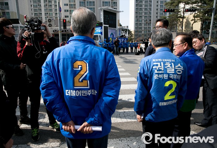 (화성=포커스뉴스) 5일 오후 경기도 화성 봉담읍 하나로마트 앞에서 열린 더불어민주당 화성지역 합동유세에 참석한 김종인(왼쪽) 비대위 대표 겸 선대위원장과 권칠승 화성병 후보가 이동하고 있다.