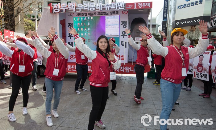 (청주=포커스뉴스) 5일 오후 충북 청주 성안길에서 새누리당 선거운동원들이 지지를 호소하고 있다.