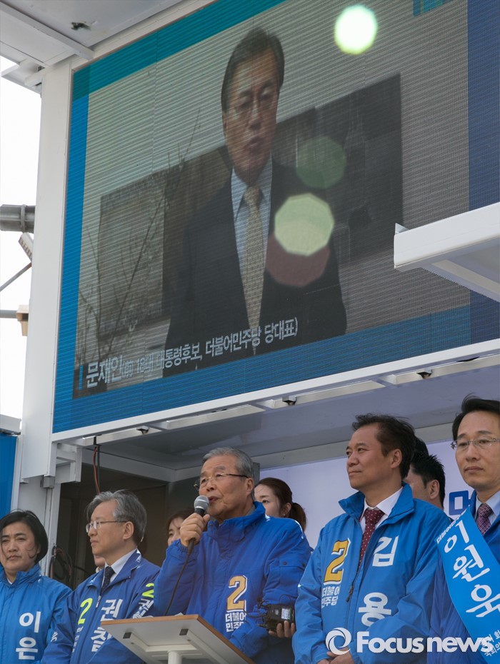 (화성=포커스뉴스) 5일 오후 경기도 화성 봉담읍 하나로마트 앞에서 열린 더불어민주당 화성지역 합동유세에 참석한 김종인 비대위 대표 겸 선대위원장과 화성 후보들이 지지를 호소하고 있다. 왼쪽부터 이은주 도의원 후보, 권칠승 화성병 후보, 김 대표, 김용 화성갑, 이원욱 화성을 후보.