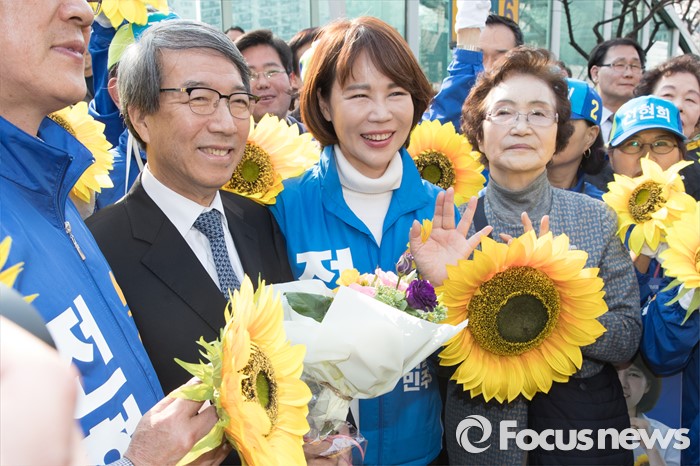 (서울=포커스뉴스) 20대 총선에 출마한 전현희 더불어민주당 강남을 후보가 5일 오후 서울 수서역 인근에서 전 후보의 고문으로 활동하기로 한 정운찬 전 국무총리와 함께 유권자들에게 지지를 호소하고 있다.