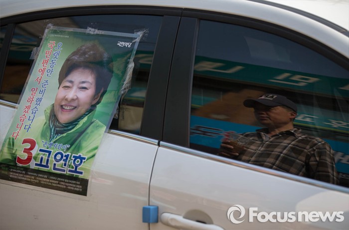 (서울=포커스뉴스) 5일 오후 서울 은평구 갈현동 인근에서 고연호 후보의 유세가 시작된 가운데 한 시민이 유세차량에 붙은 고연호 후보의 포트터를 바라보고 있다.