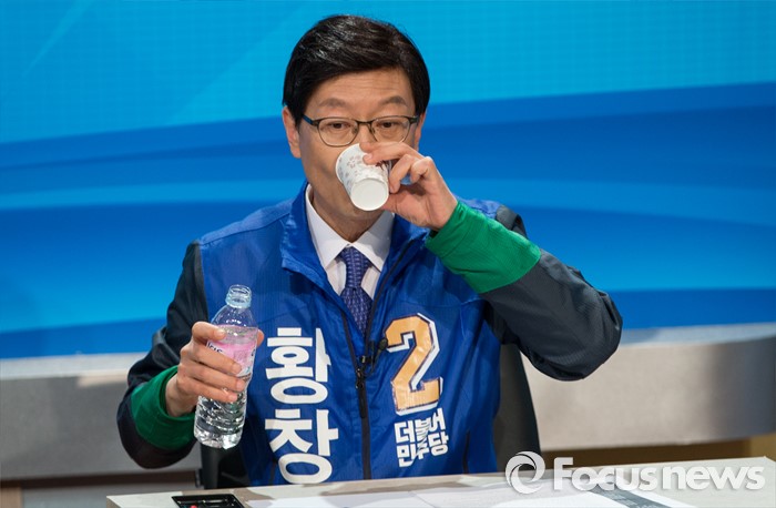 (서울=포커스뉴스) 황창화 더불어민주당 노원병 후보가 5일 오후 노원구 인덕대학에서 열린 '노원후보자 TV토론회' 시작에 앞서 물을 마시고 있다.