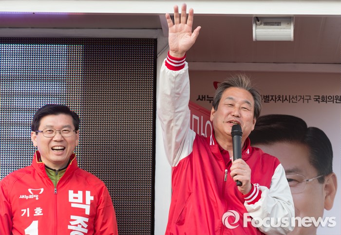 (세종=포커스뉴스) 김무성 새누리당 대표가 5일 오후 세종시 조치원읍 조치원역 앞 교차로에서 박종준 후보의 지지를 호소하고 있다.