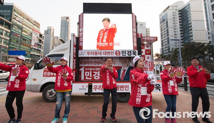 (인천=포커스뉴스) 20대 총선에 출마한 새누리당 민경욱 연수을 후보가 5일 오후 인천 연수구 송도동에서 로고송에 맞춰 선거율동을 선보이고 있다.
