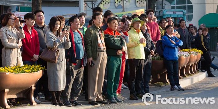 (세종=포커스뉴스) 5일 오후 세종시 조치원읍 조치원역 앞 교차로에서 시민들이 김무성 새누리당 대표의 유세를 바라보고 있다.