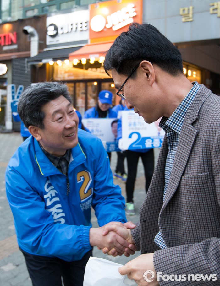 (인천=포커스뉴스) 20대 총선에 출마한 더불어민주당 윤종기 연수을 후보가 5일 오후 인천 연수구 송도동 일대에서 유권자에게 지지를 호소하고 있다.
