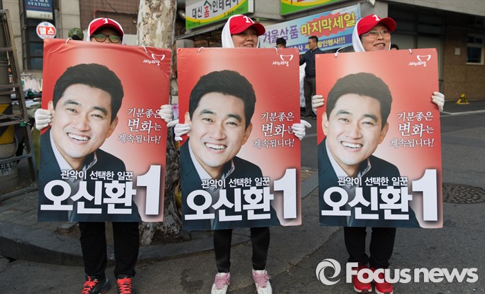 (서울=포커스뉴스) 5일 오후 서울 관악구 김한의원 앞에서 오신환 새누리당 관악구을 후보 선거운동원들이 지지를 호소하고 있다.