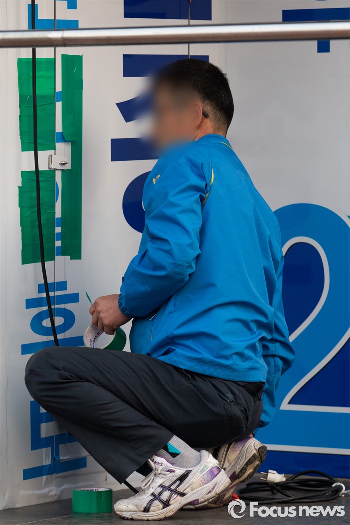 (인천=포커스뉴스) 5일 오후 인천 연수구 송도동 인근에서 윤종기 더불어민주당 연수을 후보 선거사무소 관계자가 유세차량의 야권 단일후보 명칭을 가리고 있다.