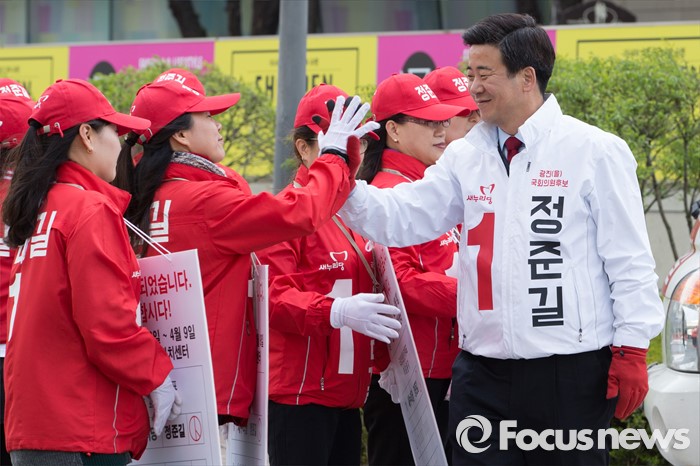 (서울=포커스뉴스) 20대 총선에 출마한 정준길 새누리당 광진을 후보가 5일 오후 서울 건대입구역 인근에서 선거운동원들과 하이파이브를 하고 있다.