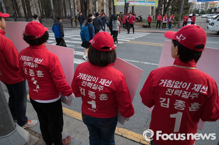 (서울=포커스뉴스) 5일 오후 서울 강남구 개포주공1단지아파트 인근에서 20대 총선에 출마한 김종훈 새누리당 강남을 후보의 선거운동원들이 유권자들에게 지지를 호소하고 있다.