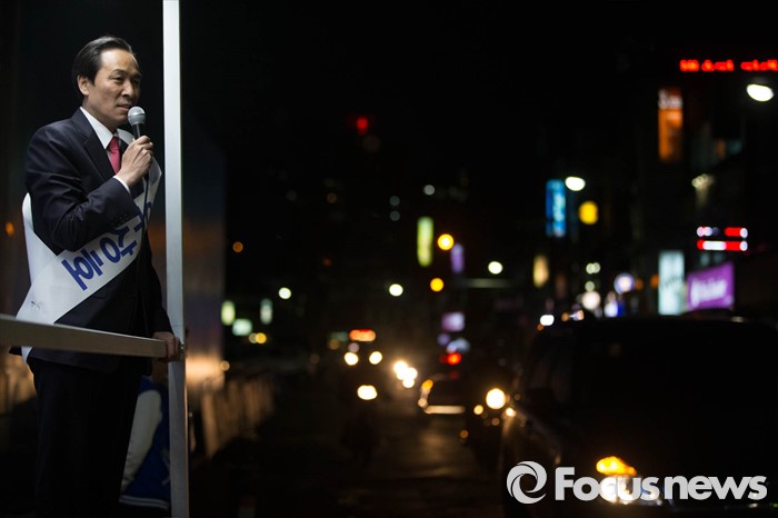 (서울=포커스뉴스) 5일 오후 서울 서대문구 아현역 인근에서 더불어민주당 우상호 서대문갑 후보가 시민들을 만나 유세를 하고 있다.