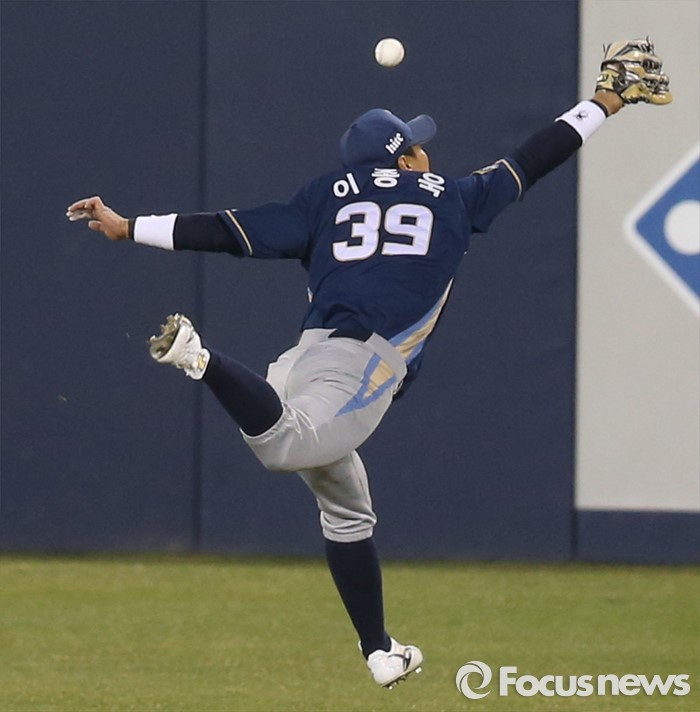 (서울=포커스뉴스) 5일 서울 잠실구장에서 열린 2016프로야구 NC-두산 경기 2회말 2사 만루에서 NC 중견수 이종욱이 두산 허경민의 타구를 잡기위해 몸을 날리고 있다. 허경민은 3루타를 기록하며 주자를 모두 불러 들였다.
