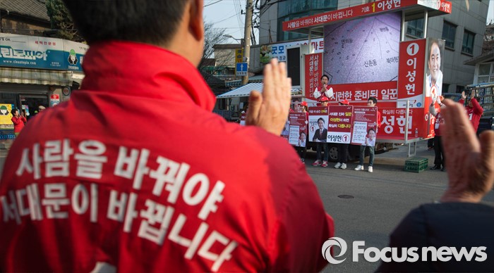 (서울=포커스뉴스) 5일 오후 서울 서대문구 충현동 인근에서 새누리당 서대문갑 이성헌 후보가 유세를 하고 있다.