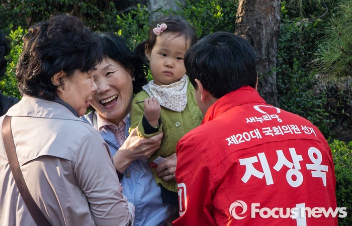(서울=포커스뉴스) 5일 오후 서울 중구 약수시장 인근에서 지원유세를 가진 지상욱 새누리당 중구성동구을 후보가 한 어린이와 악수하고 있다.