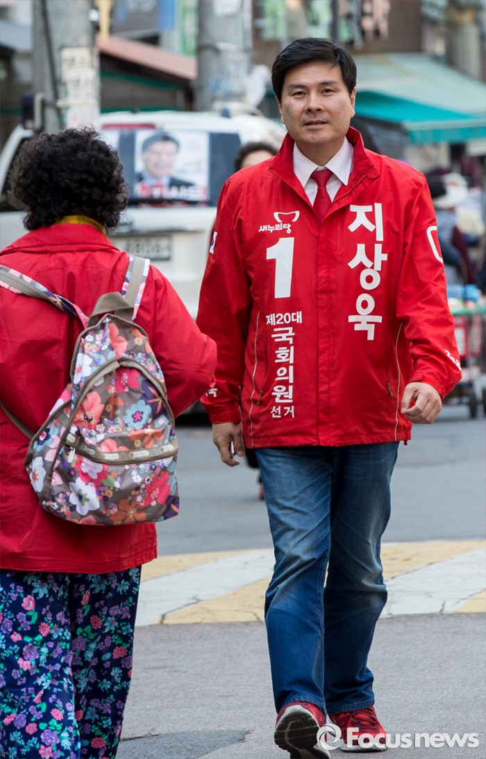 (서울=포커스뉴스) 5일 오후 서울 중구 약수시장 인근에서 지원유세를 가진 지상욱 새누리당 중구성동구을 후보가 유권자들을 향해 발걸음을 옮기고 있다.