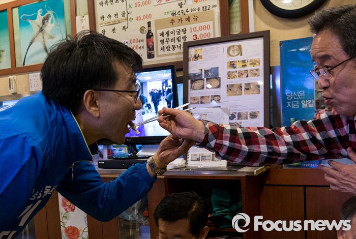 (서울=포커스뉴스) 5일 오후 서울 중구 신당역 인근에서 선거유세에 나선 이지수 더불어민주당 중구성동구을 후보가 한 식당의 시민들이 건네는 음식을 먹고 있다.
