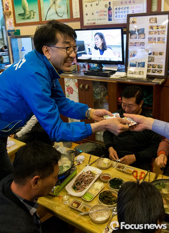 (서울=포커스뉴스) 5일 오후 서울 중구 신당역 인근에서 선거유세에 나선 이지수 더불어민주당 중구성동구을 후보가 한 식당의 시민들과 인사하고 있다.
