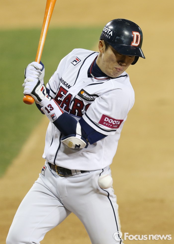 (서울=포커스뉴스) 5일 서울 잠실구장에서 열린 2016프로야구 NC-두산 경기 6회말 두산 선두타자 허경민이 NC 투수 박준영의 투구에 몸에 볼을 맞고 있다.