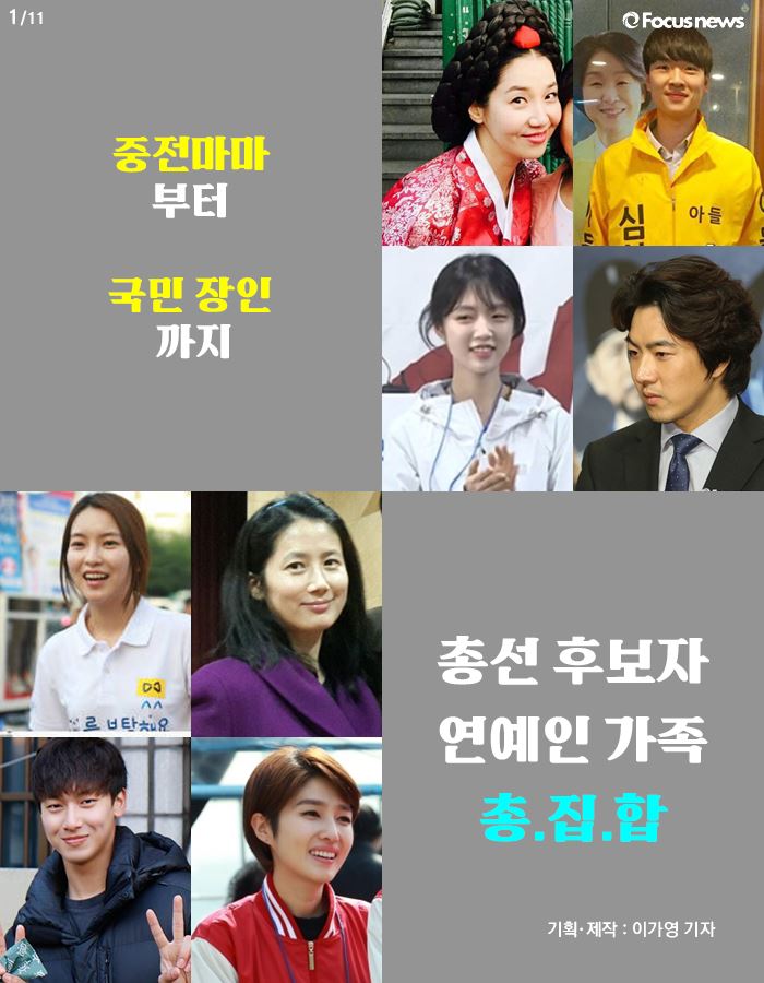 (서울=포커스뉴스) 4월 13일이 다가올수록 국회의원 후보들의 선거 운동도 치열해지고 있습니다. 총선 후보자들의 연예인 가족들도 당선을 위해 발 벗고 나섰습니다. 이들의 선거 운동 모습을 정리했습니다.