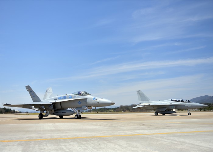(서울=포커스뉴스) 5일 제16전투비행단 FA-50 전투기와 미 해병대 1항공단 제12비행전대 F/A-18C 전투기가 연합비행 훈련을 위해 이동하고 있다. <사진제공=공군>